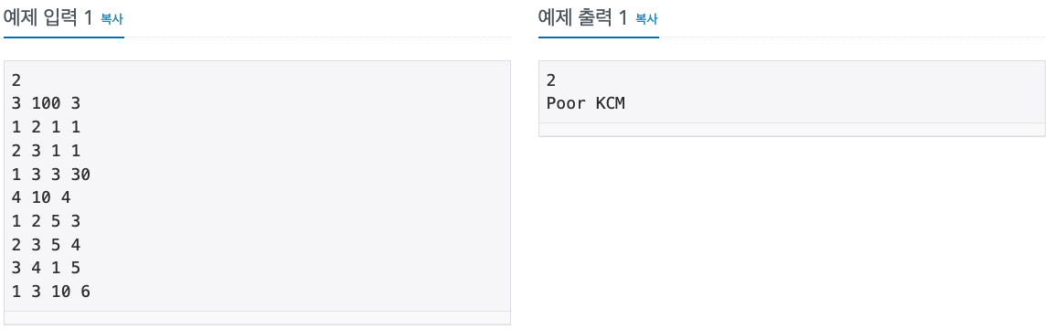 각 테스트 케이스의 첫 줄에는 공항의 수 N (2 ≤ N ≤ 100), 총 지원비용 M (0 ≤ M ≤ 10,000), 티켓정보의 수 K (0 ≤ K ≤ 10,000)가 공백으로 구분되어 주어진다. 이어서 K개의 줄에 걸쳐 각 티켓의 출발공항 u, 도착공항 v (1 ≤ u, v ≤ N, u ≠ v), 비용 c (1 ≤ c ≤ M, 정수), 그리고 소요시간 d (1 ≤ d ≤ 1,000) 가 공백으로 구분되어 주어진다. 인천은 언제나 1번 도시이고, LA는 언제나 N번 도시이다