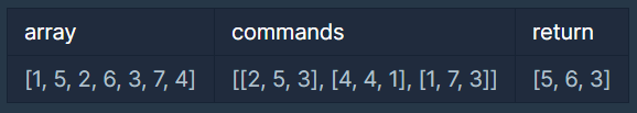 배열 array, [i, j, k]를 원소로 가진 2차원 배열 commands가 매개변수로 주어질 때, commands의 모든 원소에 대해 앞서 설명한 연산을 적용했을 때 나온 결과를 배열에 담아 return 하도록 solution 함수를 작성해주세요.