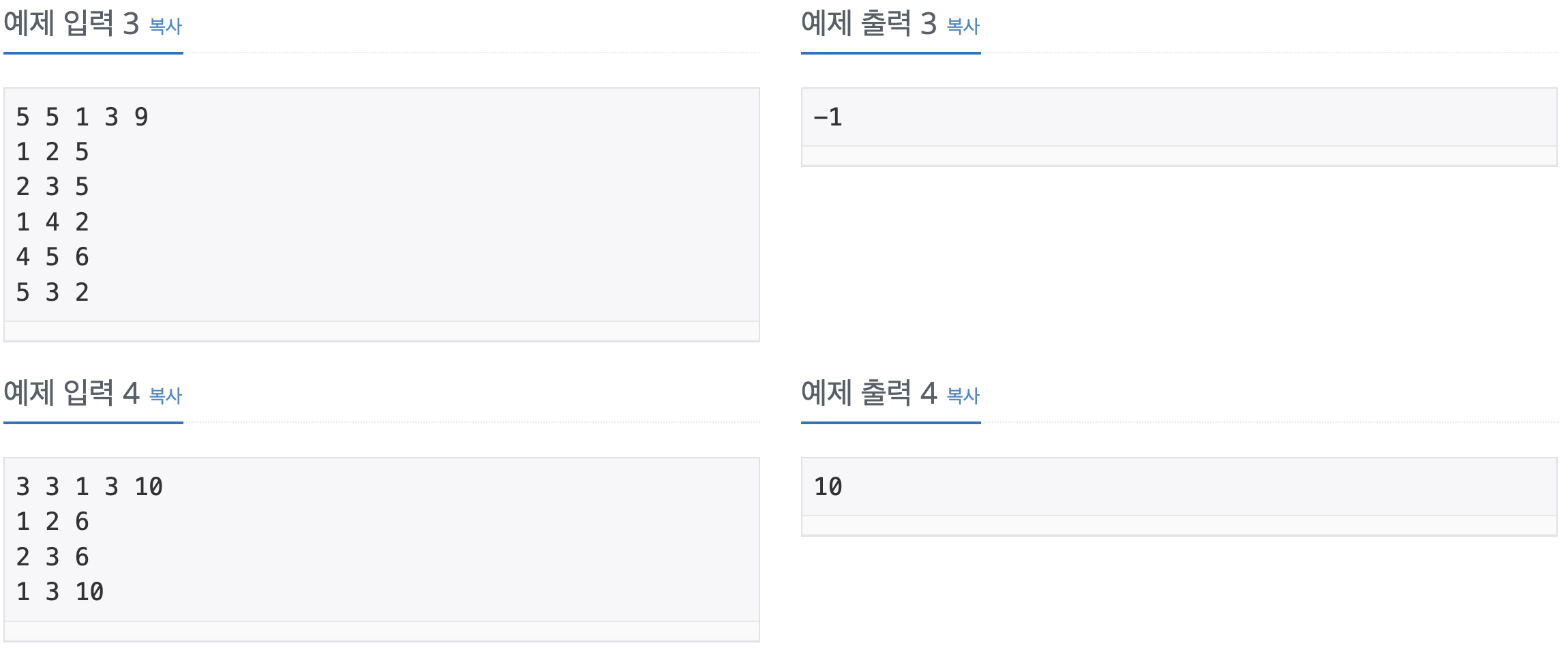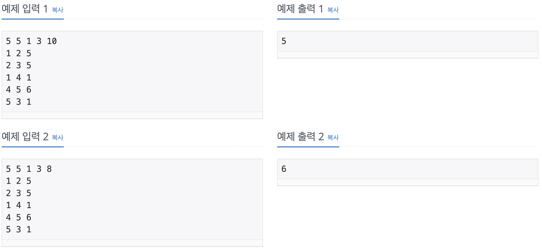 첫 줄에 교차로 개수 N, 골목 개수 M, 시작 교차로 번호 A, 도착 교차로 번호 B, 가진 돈 C 가 공백으로 구분되어 주어진다. 이어서 M 개의 줄에 걸쳐서 각 골목이 잇는 교차로 2개의 번호와, 골목의 수금액이 공백으로 구분되어 주어진다. 같은 교차로를 잇는 골목은 최대 한 번만 주어지며, 골목은 양방향이다.