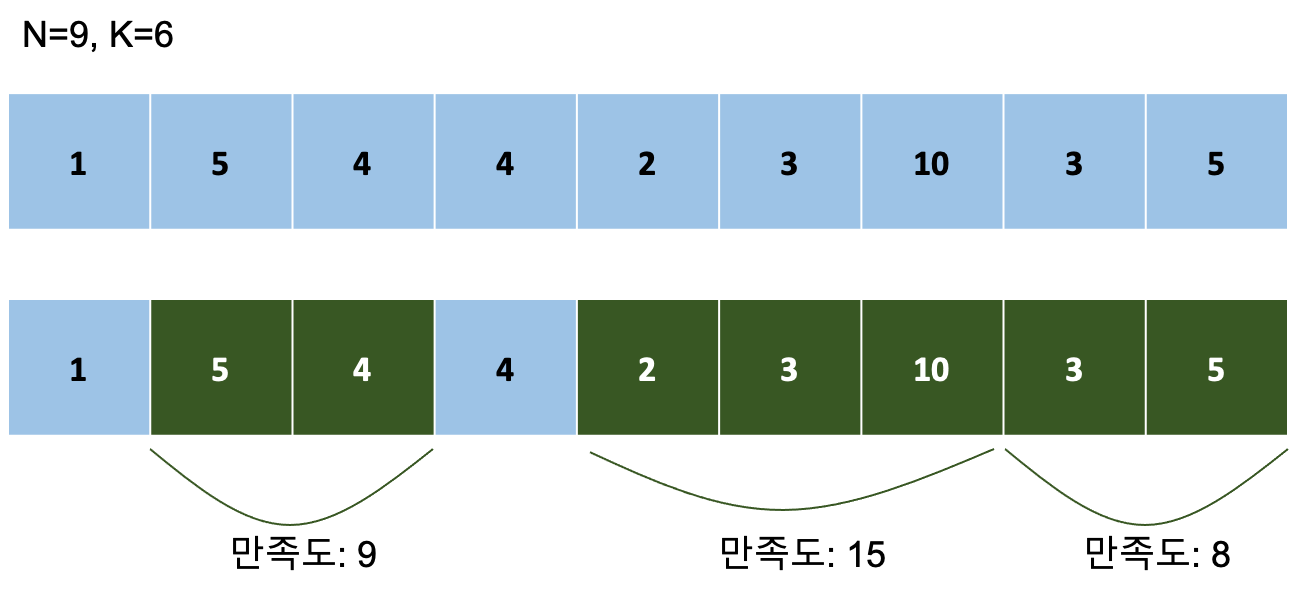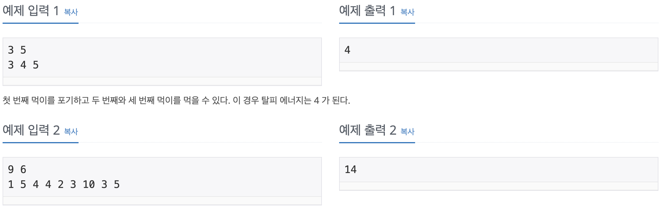 첫번째 줄에 먹이 개수 N, 최소 만족도 K 가 공백으로 주어진다.
