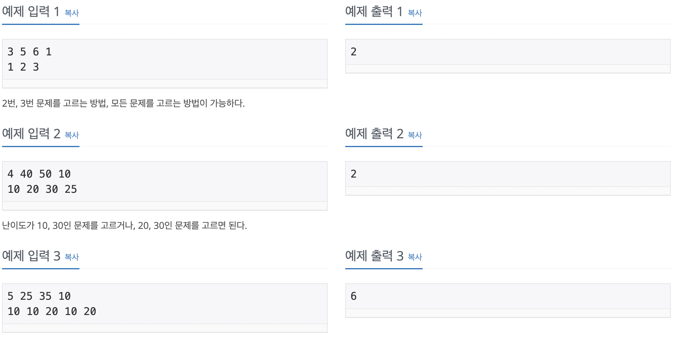 캠프에 사용할 문제는 두 문제 이상이어야 한다. 문제가 너무 어려우면 학생들이 멘붕에 빠지고, 문제가 너무 쉬우면 학생들이 실망에 빠지게 된다. 따라서, 문제 난이도의 합은 L보다 크거나 같고, R보다 작거나 같아야 한다. 또, 다양한 문제를 경험해보기 위해 가장 어려운 문제와 가장 쉬운 문제의 난이도 차이는 X보다 크거나 같아야 한다.