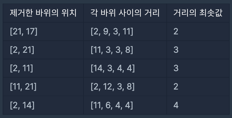 예를 들어, 도착지점이 25만큼 떨어져 있고, 바위가 [2, 14, 11, 21, 17] 지점에 놓여있을 때 바위 2개를 제거하면 출발지점, 도착지점, 바위 간의 거리가 아래와 같습니다.