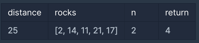 출발지점부터 distance만큼 떨어진 곳에 도착지점이 있습니다. 그리고 그사이에는 바위들이 놓여있습니다. 바위 중 몇 개를 제거하려고 합니다. 예를 들어, 도착지점이 25만큼 떨어져 있고, 바위가