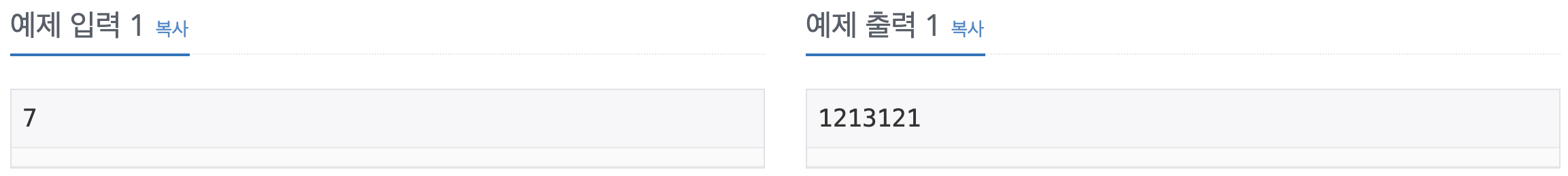 첫 번째 줄에 1, 2, 3으로만 이루어져 있는 길이가 N인 좋은 수열들 중에서 가장 작은 수를 나타내는 수열만 출력한다. 수열을 이루는 1, 2, 3들 사이에는 빈칸을 두지 않는다.