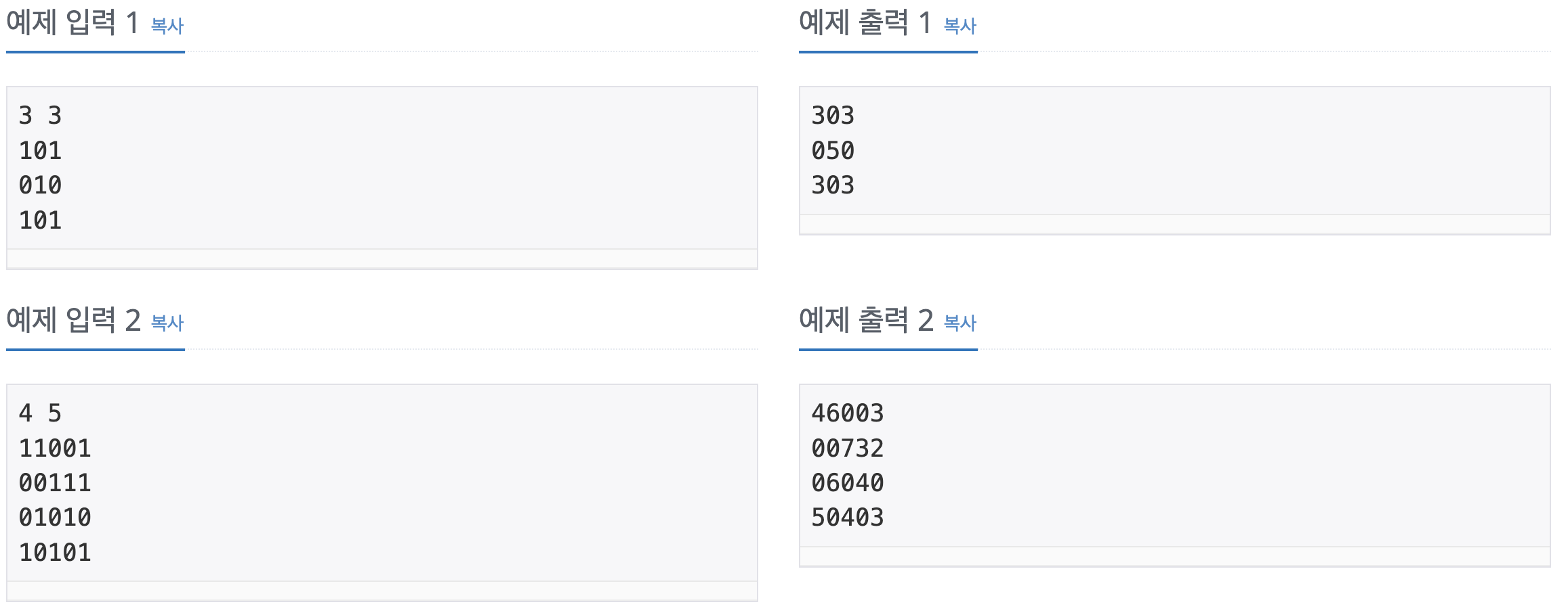 첫째 줄에 N(1 ≤ N ≤ 1,000), M(1 ≤ M ≤ 1,000)이 주어진다. 다음 N개의 줄에 M개의 숫자로 맵이 주어진다.