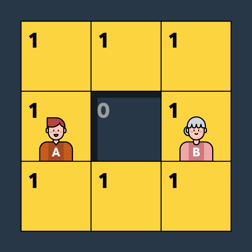 - A가 (0, 1)에서 (0, 0)으로 이동합니다. 이동을 완료함과 동시에 B가 서있던 (0, 1)의 발판이 사라집니다. B가 패배합니다.