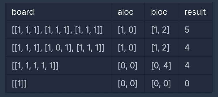 게임 보드의 초기 상태를 나타내는 2차원 정수 배열 board와 플레이어 A의 캐릭터 초기 위치를 나타내는 정수 배열 aloc, 플레이어 B의 캐릭터 초기 위치를 나타내는 정수 배열 bloc이 매개변수로 주어집니다. 양 플레이어가 최적의 플레이를 했을 때, 두 캐릭터가 움직인 횟수의 합을 return 하도록 solution 함수를 완성해주세요.