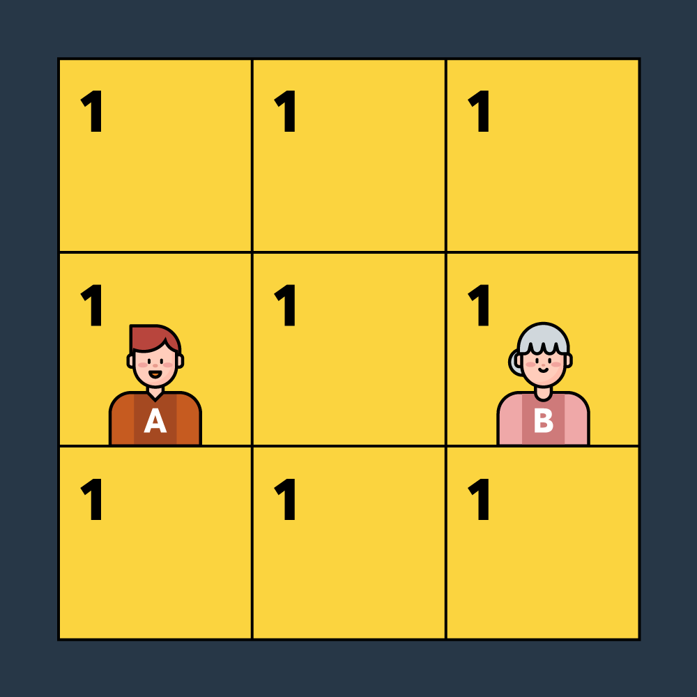 - 만약 과정 2에서 B가 아래쪽 칸인 (2, 2)로 이동하더라도 A는 (2, 1)로 이동하면 됩니다. 이후 B가 (2, 1)로 이동, 다음 차례에 A가 (2, 0)으로 이동하면 B가 패배합니다.