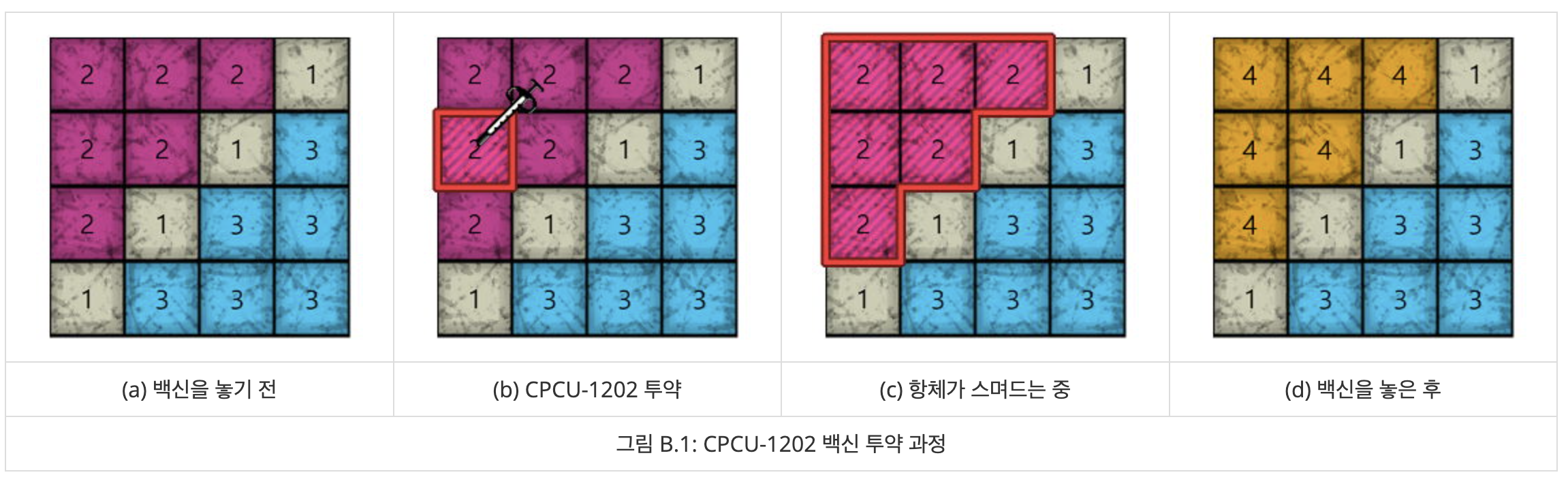 조직에 CPCU-1202 백신을 놓으면, 격자의 칸 중 하나에 항체가 생성된다. 이 항체는 현재 속해 있는 칸과 같은 데이터 값을 가지면서 상하좌우로 인접한 칸이 있을 경우 그 칸으로 퍼져나간다. 이 과정을 계속 반복하다가 항체가 더 이상 퍼져나갈 수 없게 되면, 항체는 조직에 완전히 스며든다. 그 결과로, 항체가 퍼졌던 칸들의 데이터 값은 모두 어떤 동일한 값으로 새로 업데이트된다. 이때, 우연히 원래의 데이터 값과 업데이트된 데이터 값이 동일할 수도 있다.