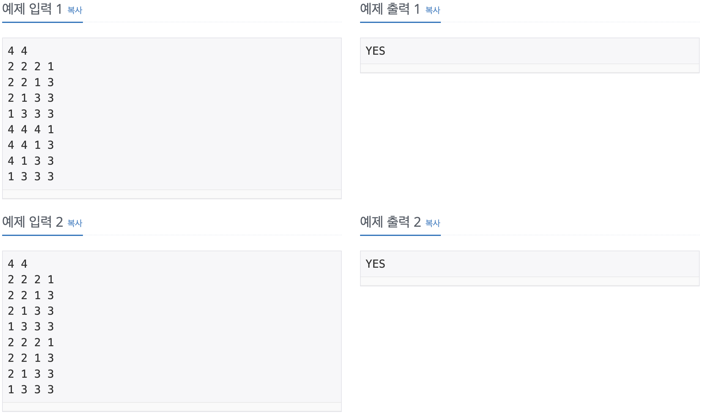 before의 모든 좌표를 탐색하면서 해당 좌표의 값이 after 그래프의 값과 다르다면 dfs 혹은 bfs로 해당 그룹을 after그래프의 값으로 바꾸어 준다. 데이터 변경은 한 번만 가능하니, 이 상태에서 before 그래프와 after그래프가 같은지 검사하면 된다.