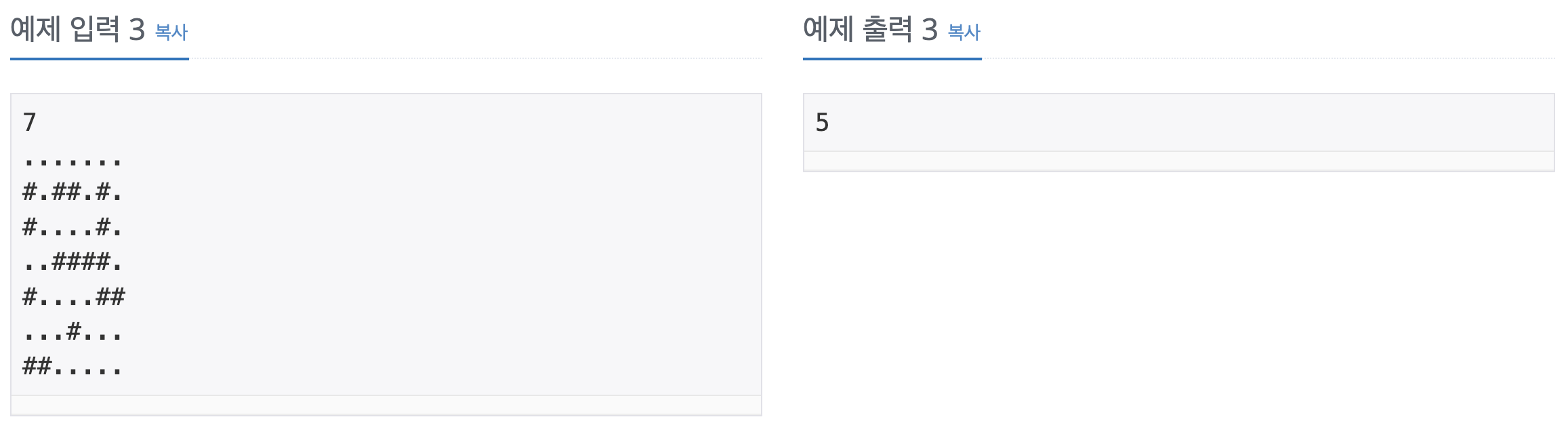 Following this is an n × n grid of characters. If a cell is cleared out, its corresponding character is a dot (.). If a cell is blocked off with corn plants, its corresponding character is a hash (#).