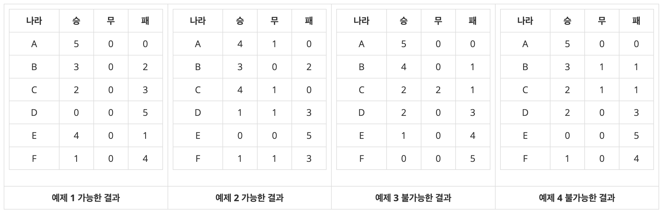 월드컵 조별 최종 예선에서는 6개국으로 구성된 각 조별로 동일한 조에 소속된 국가들과 한 번씩, 각 국가별로 총 5번의 경기를 치른다. 조별리그가 끝난 후, 기자가 보내온 각 나라의 승, 무승부, 패의 수가 가능한 결과인지를 판별하려고 한다. 다음은 가능한 결과와 가능하지 않은 결과의 예이다.