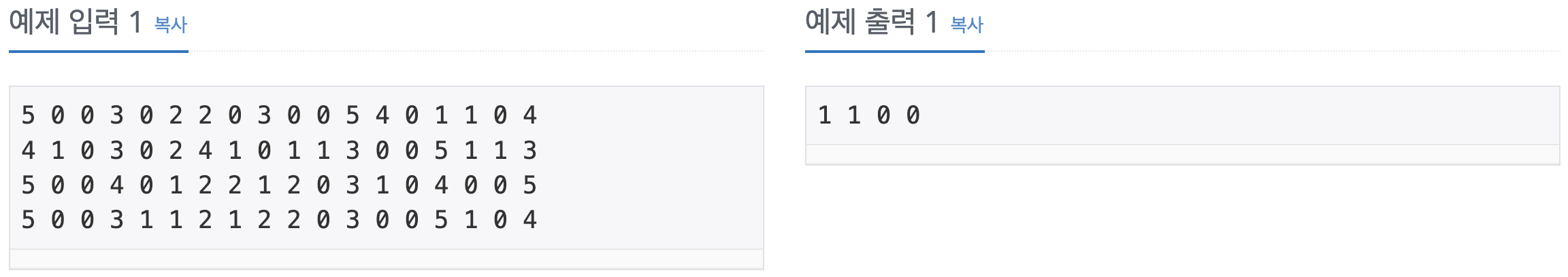 네 가지의 결과가 주어질 때 각각의 결과에 대하여 가능하면 1, 불가능하면 0을 출력하는 프로그램을 작성하시오.