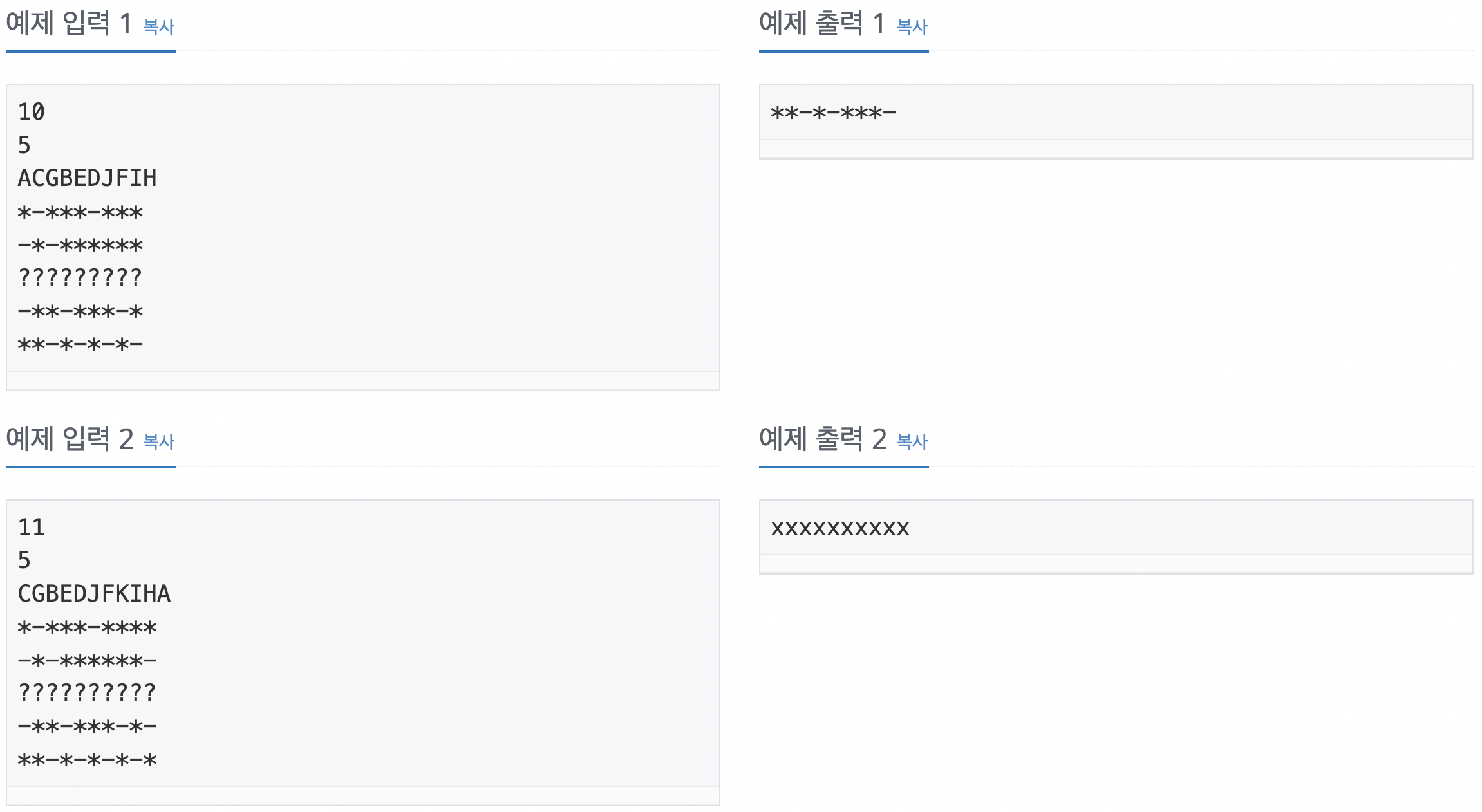 k와 n, 그리고 도착순서 문자열이 나타난 다음, 이어지는 n개의 줄에는 앞서 설명한 바와 같이 ‘*’와 ‘-’ 문자로 이루어진 길이 k-1인 문자열이 주어진다. 그 중 감추어진 가로 줄은 길이가 k-1인 ‘?’ 문자열로 표시되어 있다.