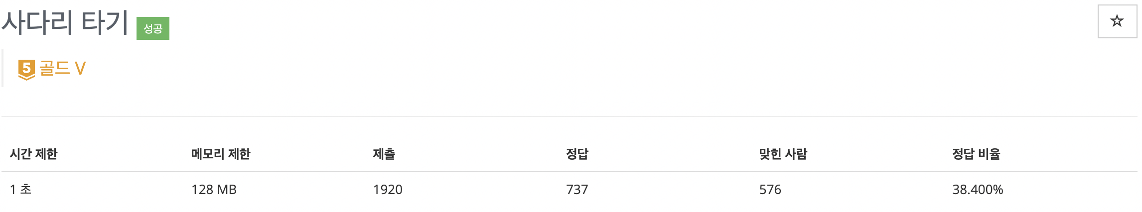 사다리 타기는 세로 막대를 타고 내려오는 중에 가로막대를 만나면 그 쪽으로 옮겨 가면서 끝까지 내려가는 과정이다. 따라서 사다리 타기의 규칙 특성상 아래 그림과 같이 두 가로 막대가 직접 연결될 수는 없으므로 이 상황은 이 문제에서 고려할 필요가 없다.