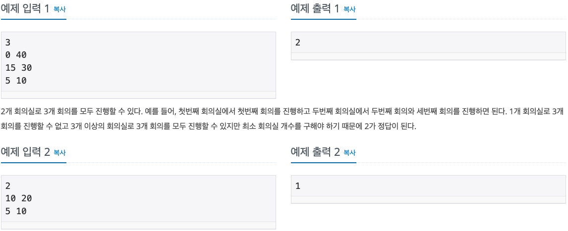 서준이는 아빠로부터 N개의 회의를 모두 진행할 수 있는 최소 회의실 개수를 구하라는 미션을 받았다. 각 회의는 시작 시간과 끝나는 시간이 주어지고 한 회의실에서 동시에 두 개 이상의 회의가 진행될 수 없다. 단, 회의는 한번 시작되면 중간에 중단될 수 없으며 한 회의가 끝나는 것과 동시에 다음 회의가 시작될 수 있다. 회의의 시작 시간은 끝나는 시간보다 항상 작다. N이 너무 커서 괴로워 하는 우리 서준이를 도와주자.