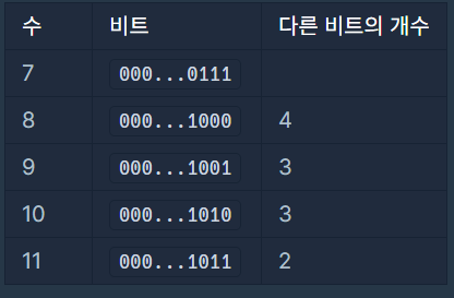 - f(7) = 11 입니다. 다음 표와 같이 7보다 큰 수들 중에서 비트가 다른 지점이 2개 이하이면서 제일 작은 수가 11이기 때문입니다.