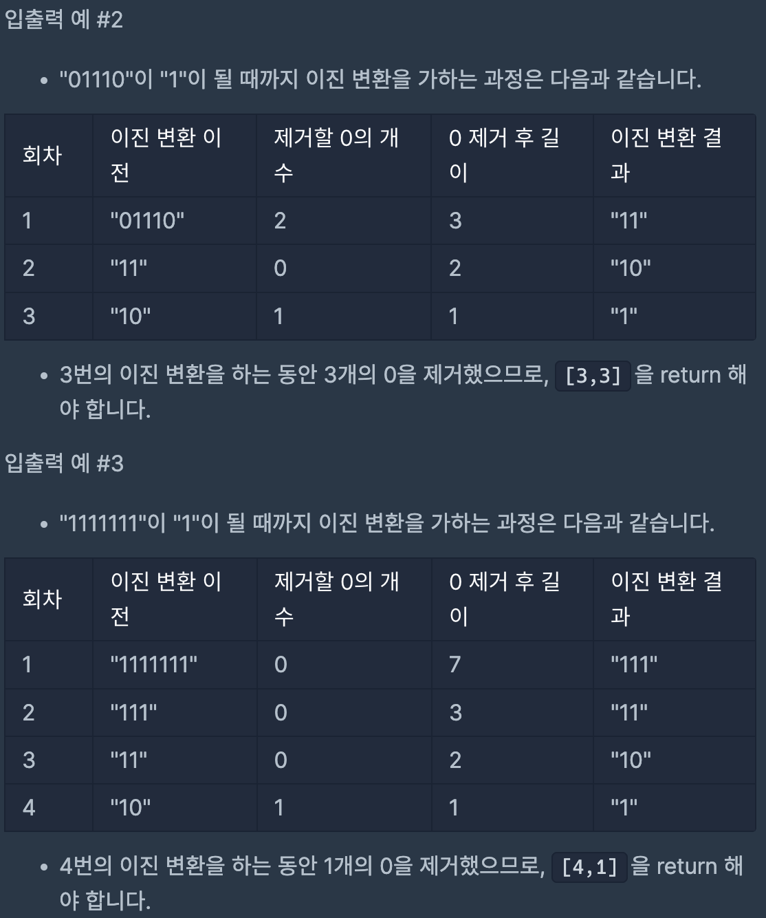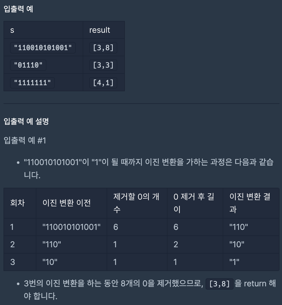 코딩테스트 연습 - 이진 변환 반복하기