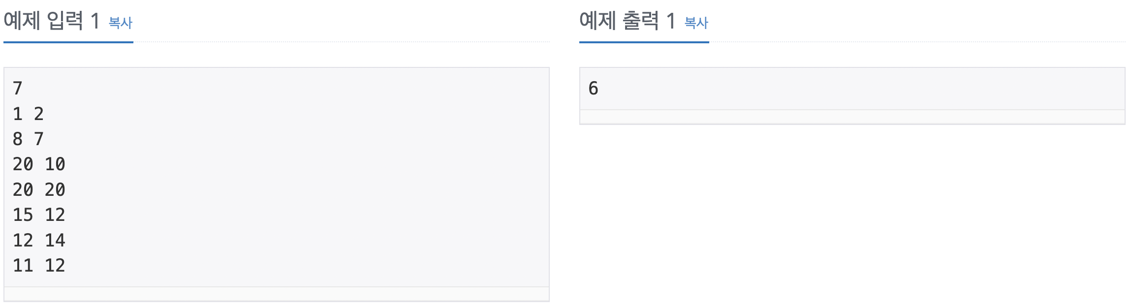 색종이는 두 변의 길이로 표현된다. (3, 5)는 두 변의 길이가 각각 3과 5인 색종이를 나타낸다. 예를 들어, 다음과 같이 7장의 색종이가 주어졌다고 하자 : (1, 2), (8, 7), (20, 10), (20, 20), (15, 12), (12, 14), (11, 12) 위의 조건을 만족하면서 가장 많이 쌓을 수 있는 색종이들의 순서는 (20, 20), (15, 12), (12, 14), (11, 12), (8, 7), (1, 2)이다.