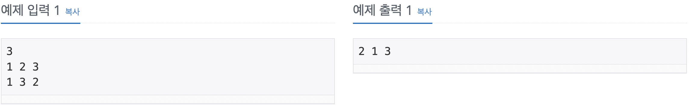 첫째 줄에 n(1 ≤ n ≤ 100,000)이 주어진다. 다음 줄에는 인오더를 나타내는 n개의 자연수가 주어지고, 그 다음 줄에는 같은 식으로 포스트오더가 주어진다.