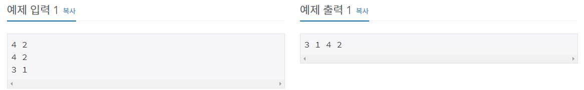 첫째 줄에 문제의 수 N(1 ≤ N ≤ 32,000)과 먼저 푸는 것이 좋은 문제에 대한 정보의 개수 M(1 ≤ M ≤ 100,000)이 주어진다. 둘째 줄부터 M개의 줄에 걸쳐 두 정수의 순서쌍 A,B가 빈칸을 사이에 두고 주어진다. 이는 A번 문제는 B번 문제보다 먼저 푸는 것이 좋다는 의미이다.