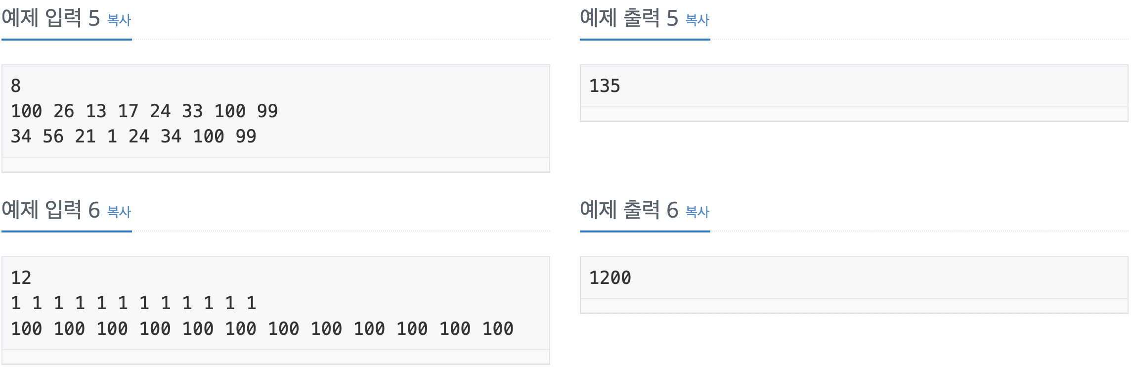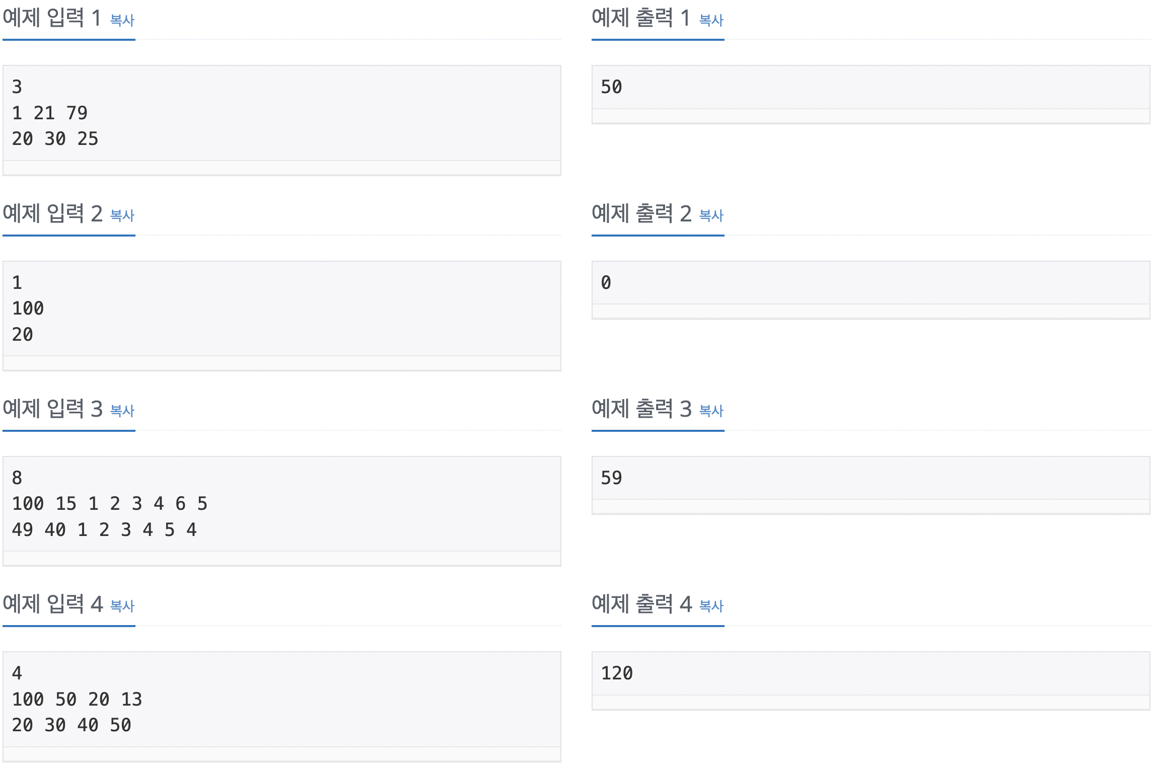 첫째 줄에 사람의 수 N(≤ 20)이 들어온다. 둘째 줄에는 각각의 사람에게 인사를 할 때, 잃는 체력이 1번 사람부터 순서대로 들어오고, 셋째 줄에는 각각의 사람에게 인사를 할 때, 얻는 기쁨이 1번 사람부터 순서대로 들어온다. 체력과 기쁨은 100보다 작거나 같은 자연수 또는 0이다.