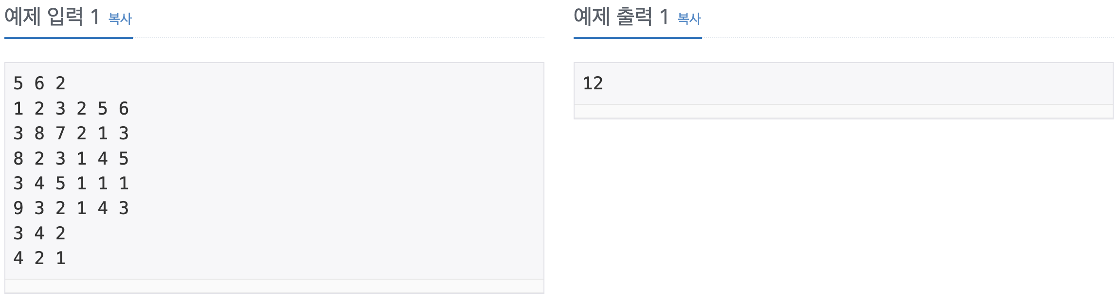 크기가 N×M 크기인 배열 A가 있을때, 배열 A의 값은 각 행에 있는 모든 수의 합 중 최솟값을 의미한다. 배열 A가 아래와 같은 경우 1행의 합은 6, 2행의 합은 4, 3행의 합은 15이다. 따라서, 배열 A의