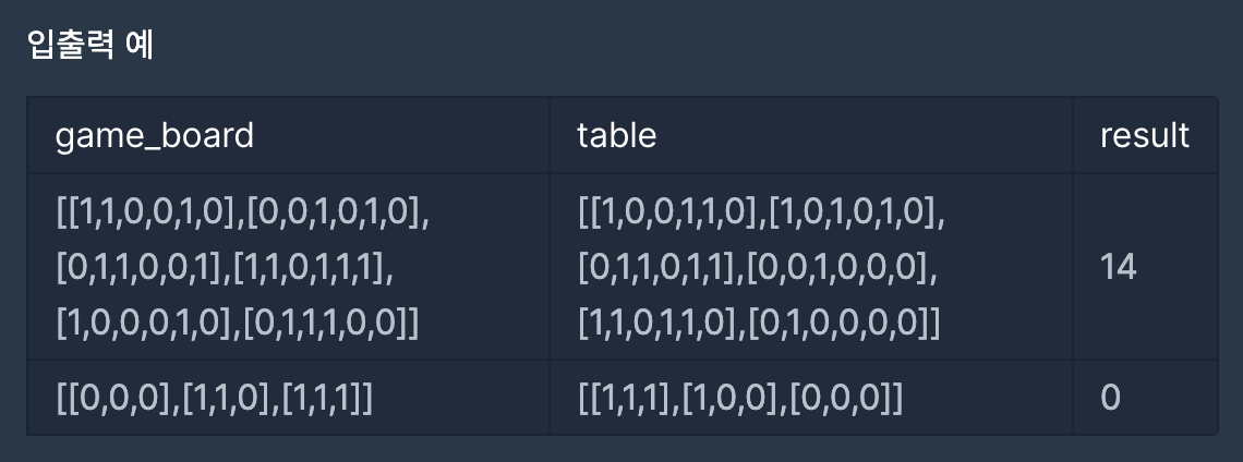현재 게임 보드의 상태 game_board, 테이블 위에 놓인 퍼즐 조각의 상태 table이 매개변수로 주어집니다. 규칙에 맞게 최대한 많은 퍼즐 조각을 채워 넣을 경우, 총 몇 칸을 채울 수 있는지 return 하도록 solution 함수를 완성해주세요.