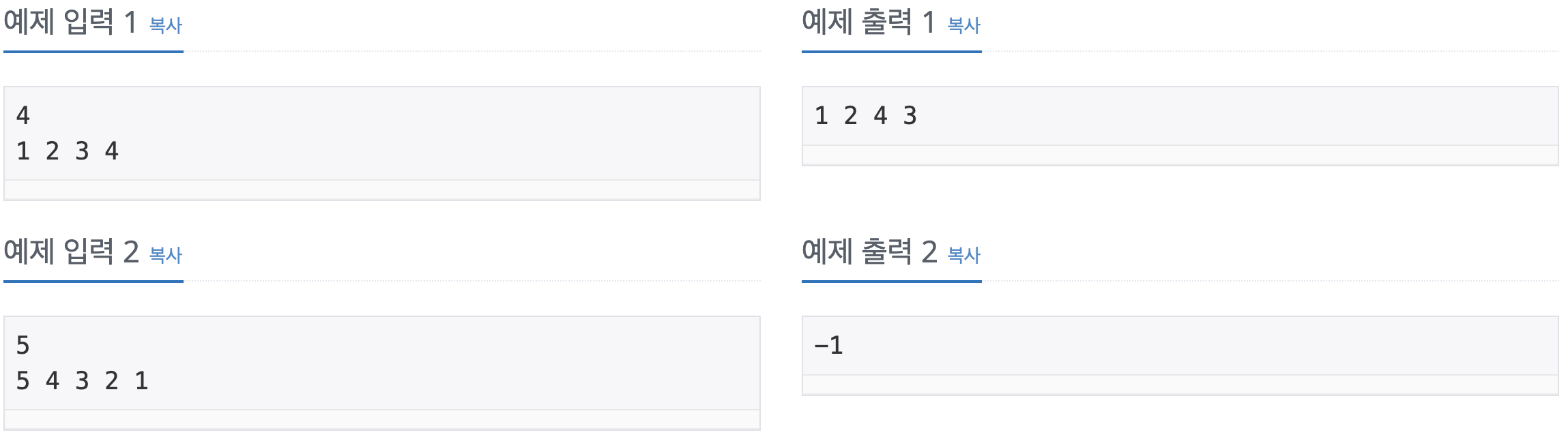 첫째 줄에 입력으로 주어진 순열의 다음에 오는 순열을 출력한다. 만약, 사전순으로 마지막에 오는 순열인 경우에는 -1을 출력한다.