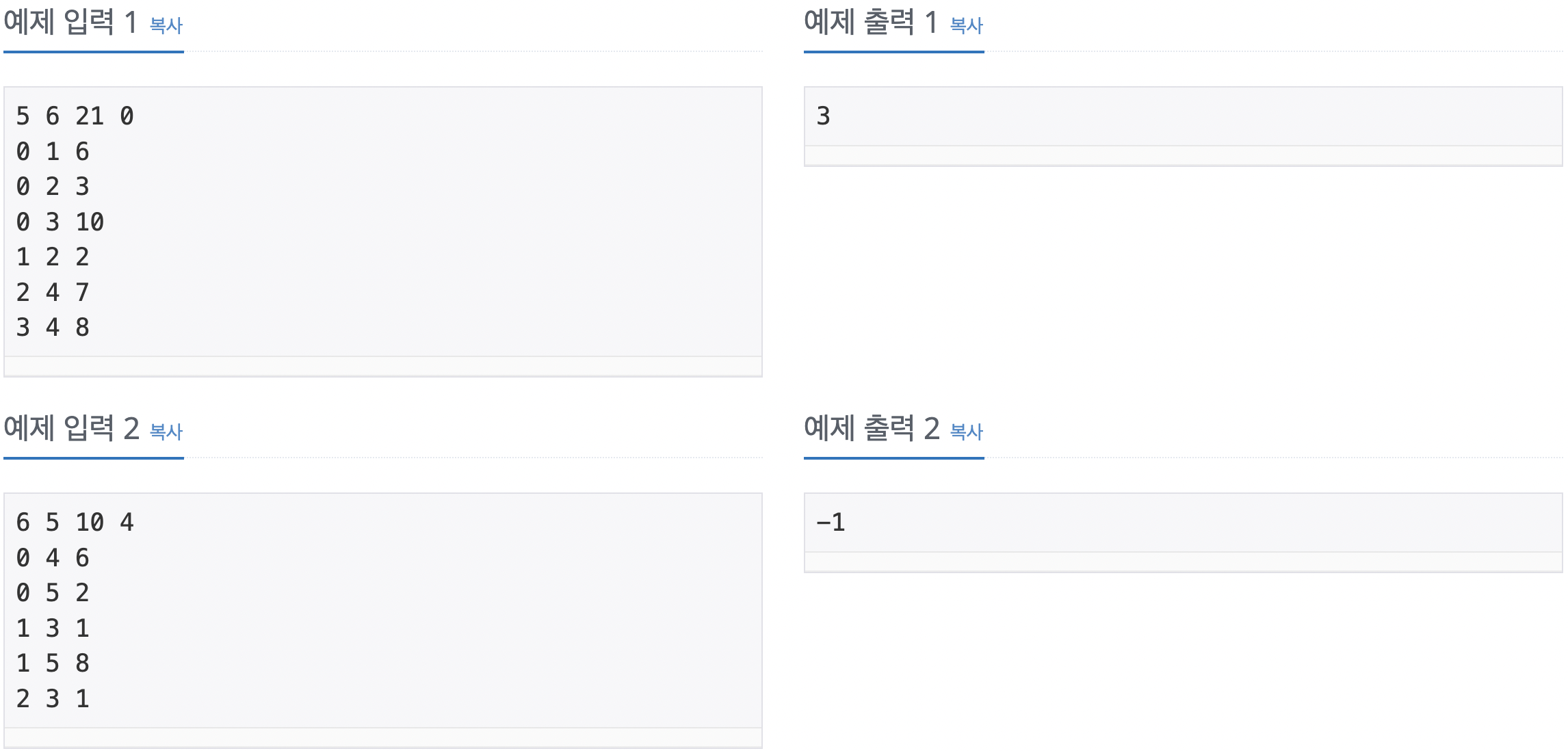 첫째줄에 N, M, X, Y가 공백으로 구분되어 입력된다. (2 ≤ N ≤ 1,000, 1 ≤ M ≤ 100,000, 1 ≤ X ≤ 10,000,000, 0 ≤ Y < N) 두번째 줄부터 M+1번째 줄까지 A와 B 그리고 A집과 B집 사이의 도로의 길이 C가 주