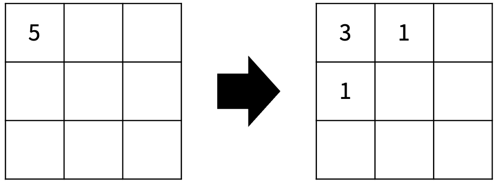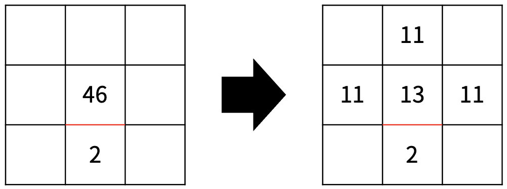 (1, 1)에서 (1, 2)와 (1, 3)으로 공기가 섞인다.