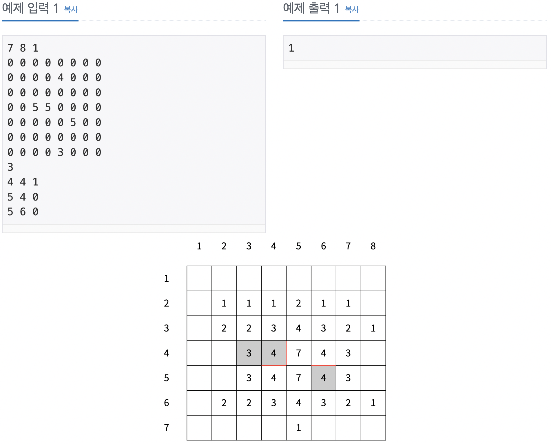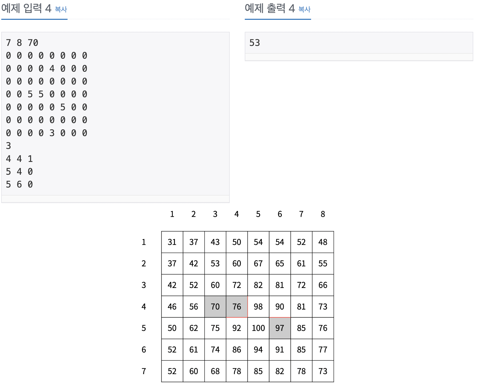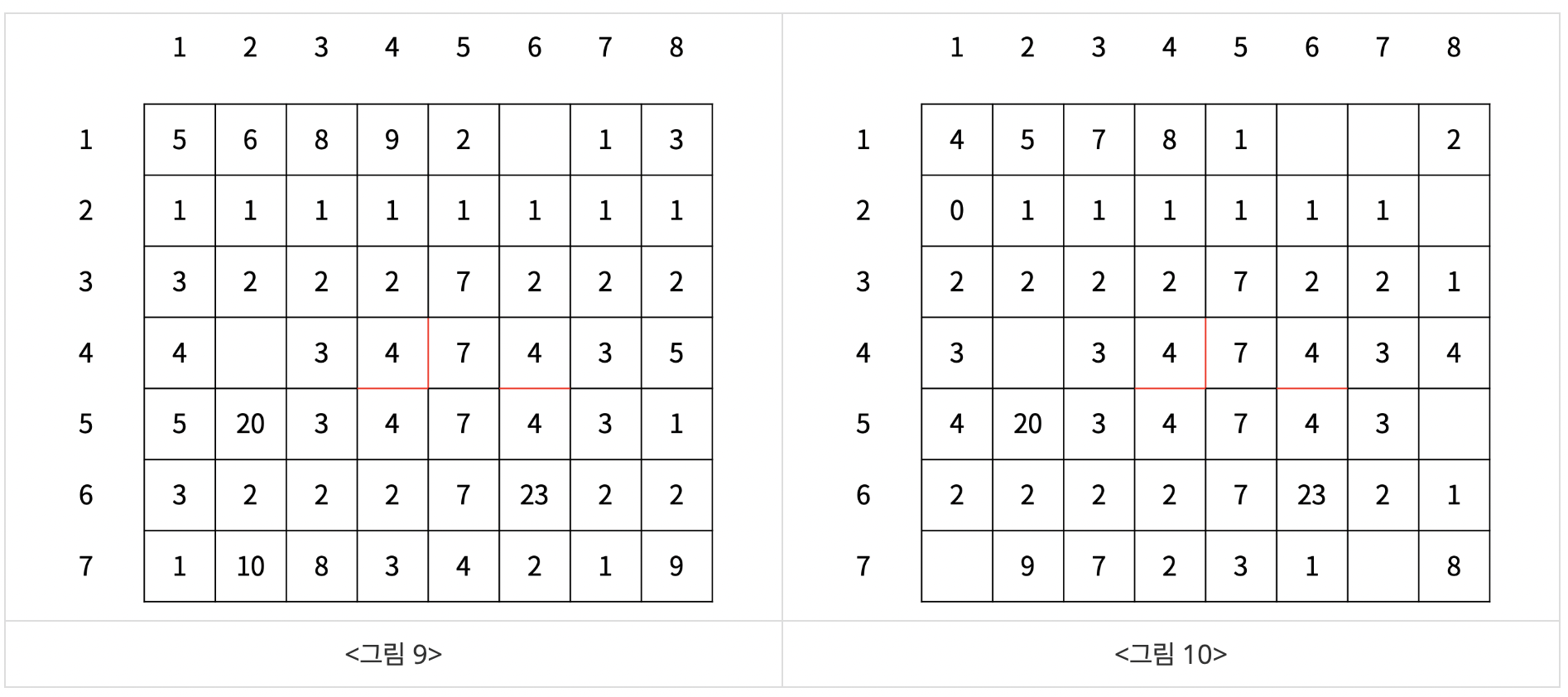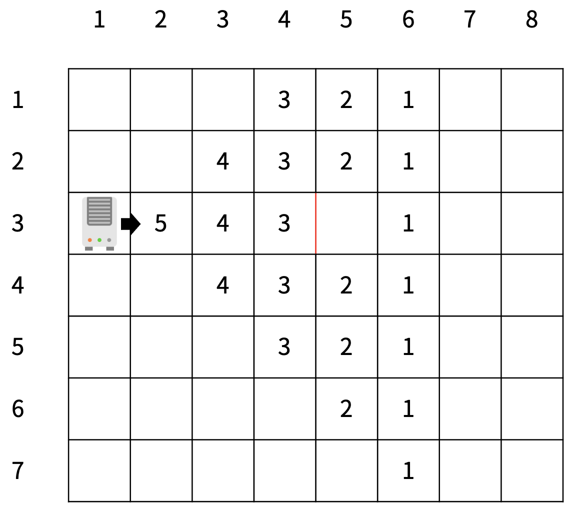 예를 들어, (3, 4)와 (3, 5) 사이에 벽이 있는 경우 온풍기에서 바람이 한 번 나왔을 때 온도는 <그림 4>와 같이 상승한다. 벽은 빨간색으로 표시했다.