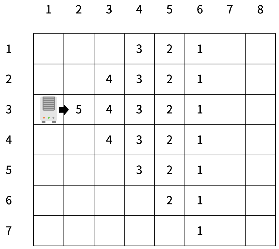 <그림 1>은 크기가 7×8인 집에 온풍기가 (3, 1)에 설치되어 있는 상황이다. 온풍기는 바람이 나오는 방향이 있는데, 그 방향은 오른쪽, 왼쪽, 위, 아래 중 하나이다. 온풍기에서 따뜻한 바람이 한 번 나오면, 다음과 같은 영역의 온도가 칸에 적힌 값만큼 증가하게 된다. 아래 그림은 오른쪽 방향으로 바람이 나온 예시이며, 온풍기에서 바람이 나오는 방향에 따라 <그림 2>를 회전시켜서 해당하는 방향으로 바람이 나왔을 때 증가하는 온도를 구할 수 있다.