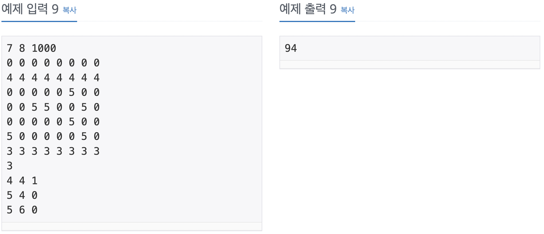 첫째 줄에 세 정수 R, C, K가 주어진다. 둘째 줄부터 R개의 줄에 방의 정보가 주어진다. i번째 줄의 j번째 정수는 (i, j)의 정보를 의미하며 다음 중 하나이다.