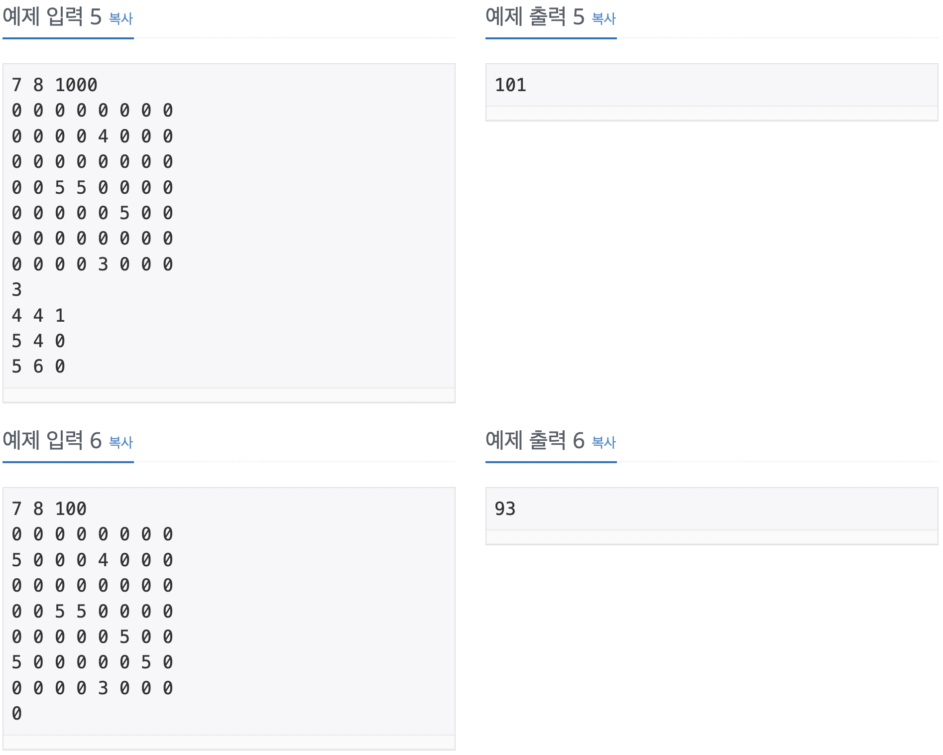 - 온풍기는 하나 이상 있고, 온도를 조사해야 하는 칸도 하나 이상 있다.