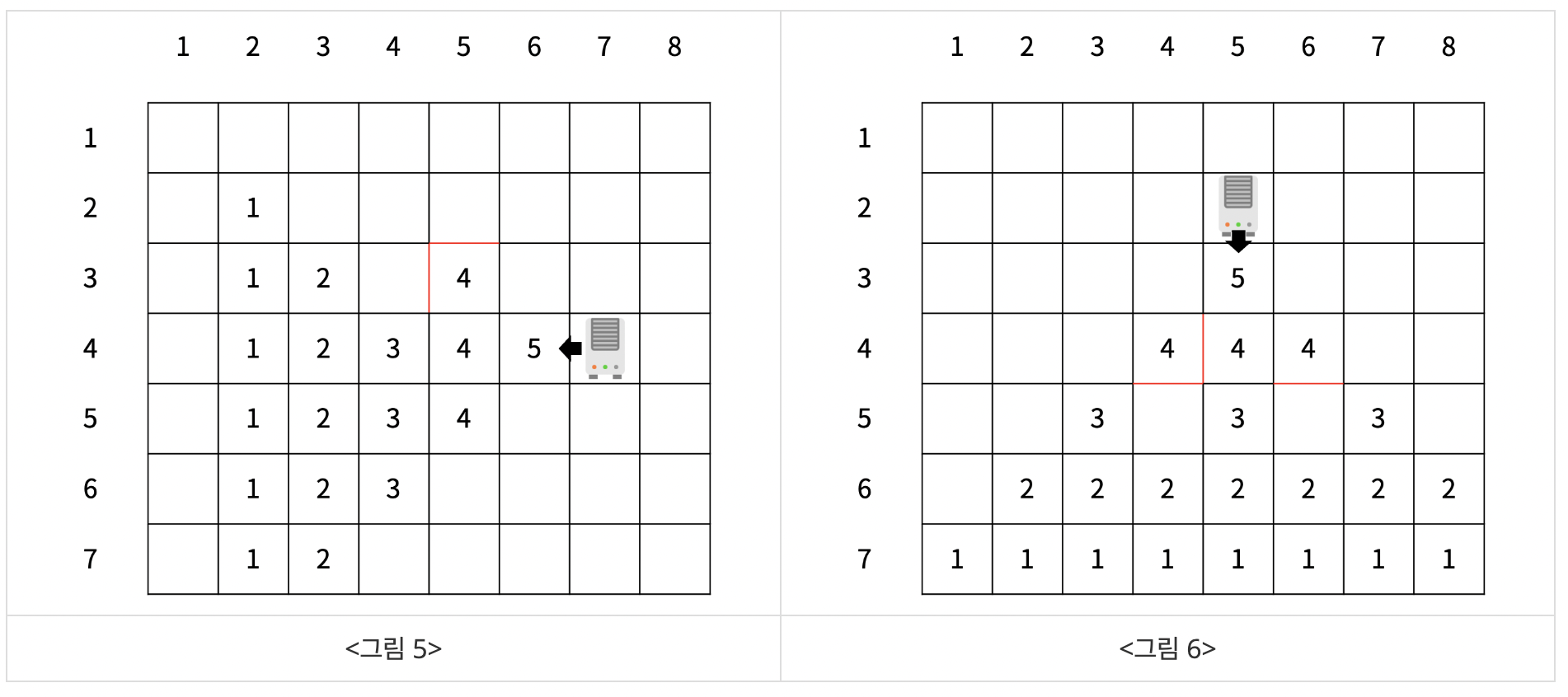 만약 바람의 방향이 왼쪽인 온풍기가 (4, 7)에 있고, (3, 4)와 (3, 5) 사이에 벽, (2, 5)와 (3, 5) 사이에 벽이 있는 경우라면 온풍기에서 바람이 한 번 나왔을 때 <그림 5>와 같이 온도가 상승한다. <그림 6>은 바람의 방향이 아래인 온풍기가 (2, 5)에 있고, (4, 4)와 (4, 5) 사이, (4, 4)와 (5, 4) 사이, (4, 6)과 (5, 6) 사이에 벽이 있는 경우이다.
