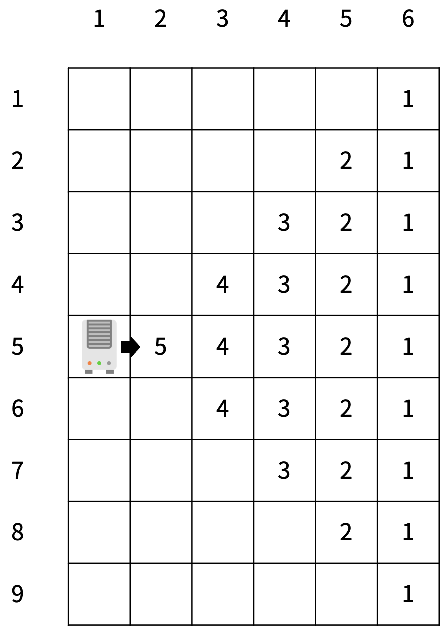 온풍기에서 바람이 한 번 나왔을 때, 온풍기의 바람이 나오는 방향에 있는 칸은 항상 온도가 5도 올라간다. 그 다음 이 바람은 계속 다른 칸으로 이동해 다른 칸의 온도를 위의 그림과 같이 상승시키게 된다. 어떤 칸 (x, y)에 온풍기 바람이 도착해 온도가 k (> 1)만큼 상승했다면, (x-1, y+1), (x, y+1), (x+1, y+1)의 온도도 k-1만큼 상승하게 된다. 이때 그 칸이 존재하지 않는다면, 바람은 이동하지 않는다. 온풍기에서 바람이 한 번 나왔을 때, 어떤 칸에 같은 온풍기에서 나온 바람이 여러 번 도착한다고 해도 온도는 여러번 상승하지 않는다.
