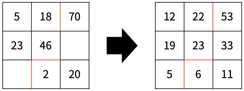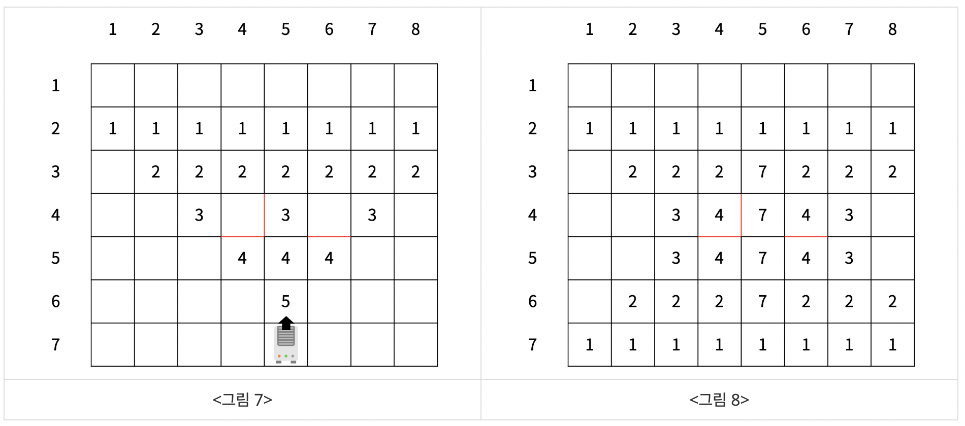 예를 들어, <그림 7>은 <그림 6>과 같은 벽을 가지고 있는 집에서 바람이 방향이 위인 온풍기가 (7, 5)에 있는 경우이고, <그림 8>는 <그림 6>과 같은 벽을 가지고 있는 집에서 바람의 방향이 아래인 온풍기가 (2, 5)에 있고, 바람의 방향이 위인 온풍기가 (7, 5)에 있는 경우이다. <그림 8>는 같은 벽을 가지고 있는 집에서 <그림 6>의 온풍기와 <그림 7>의 온풍기가 동시에 설치된 상황이기 때문에, 각 칸의 상승한 온도는 두 그림의 값을 더한 값과 같다. 온풍기가 있는 칸도 다른 온풍기에 의해 온도가 상승할 수 있기 때문에, <그림 8>에서 온풍기의 위치는 표시하지 않았다.