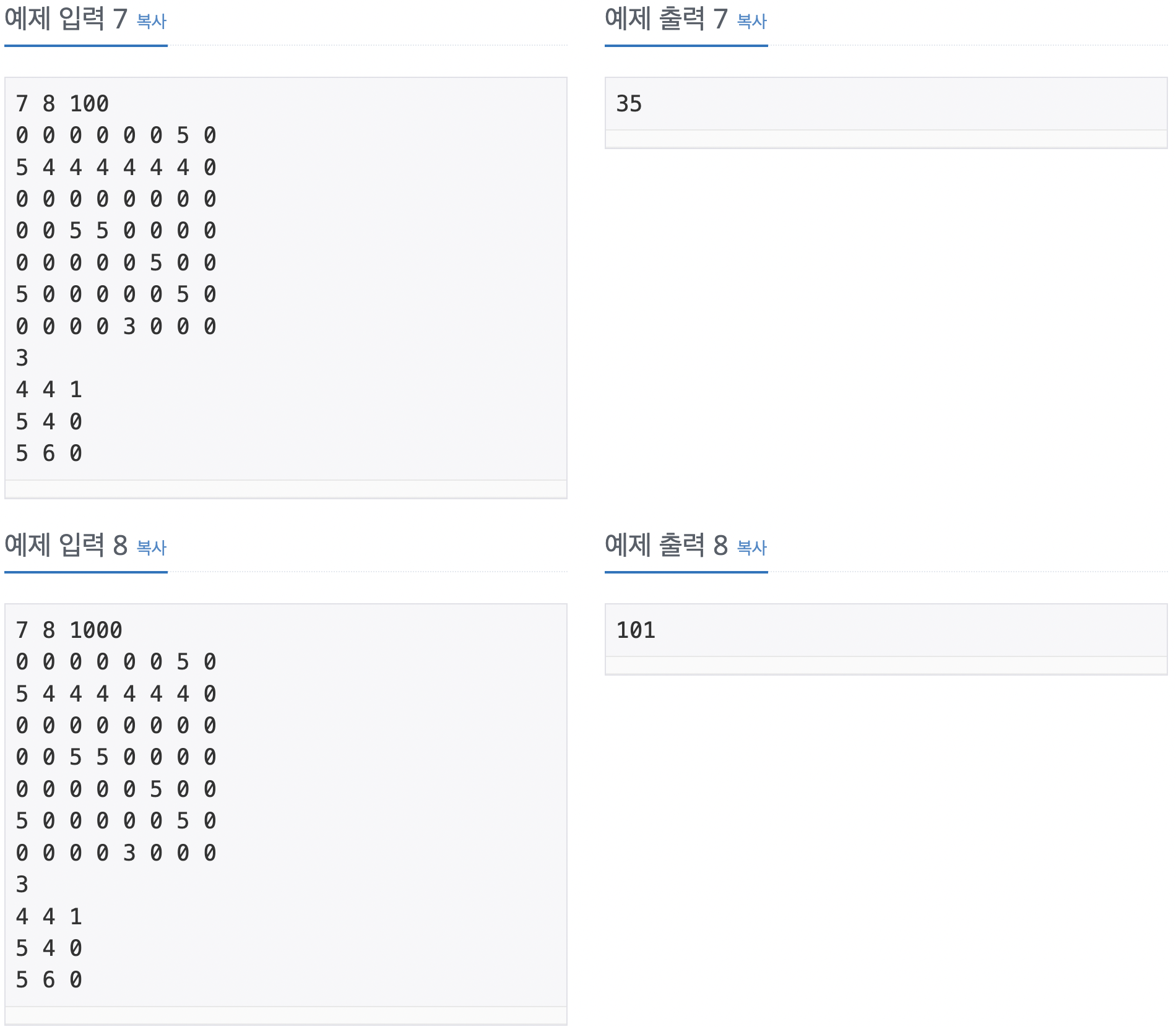 - 온풍기는 하나 이상 있고, 온도를 조사해야 하는 칸도 하나 이상 있다.