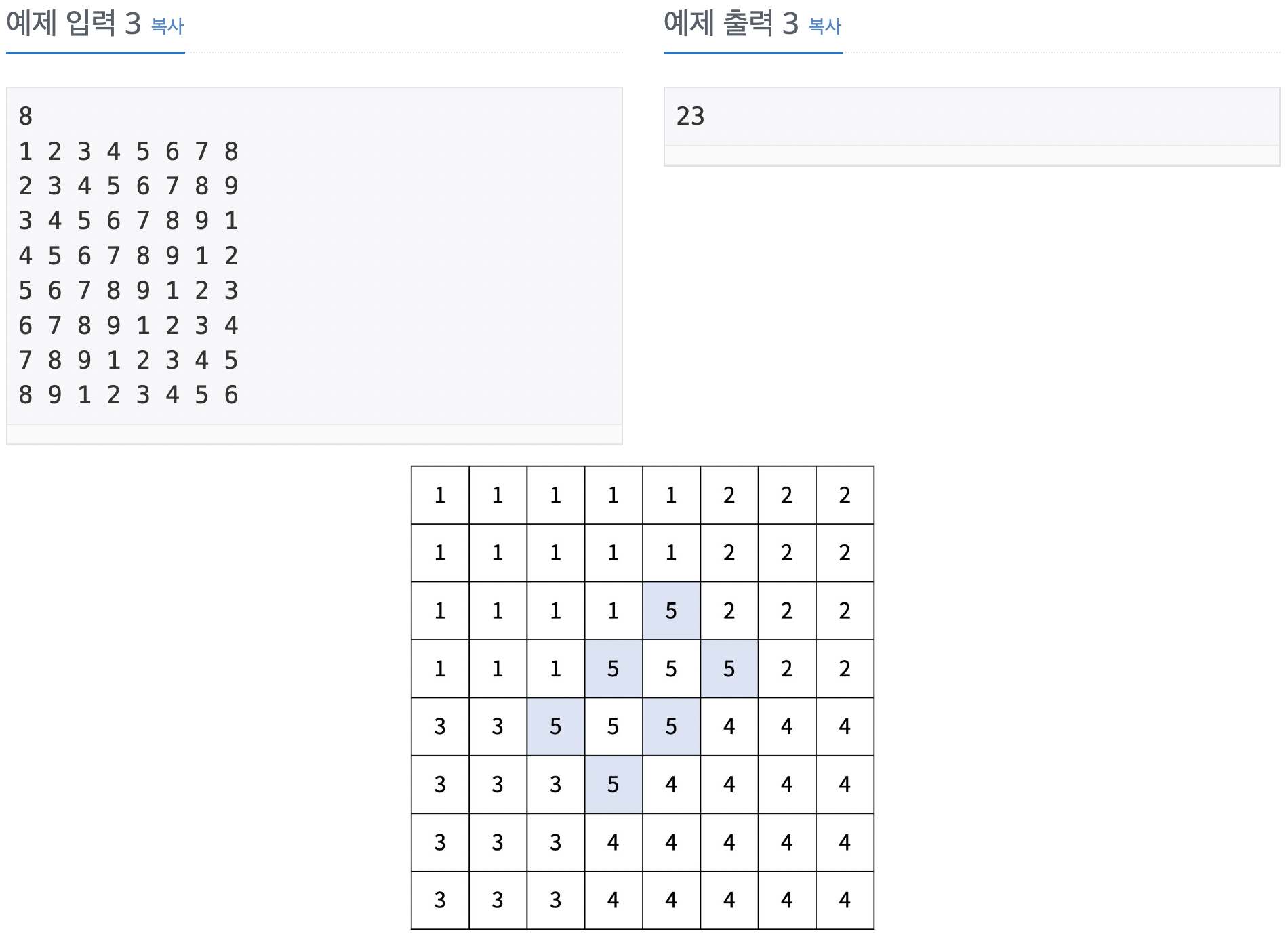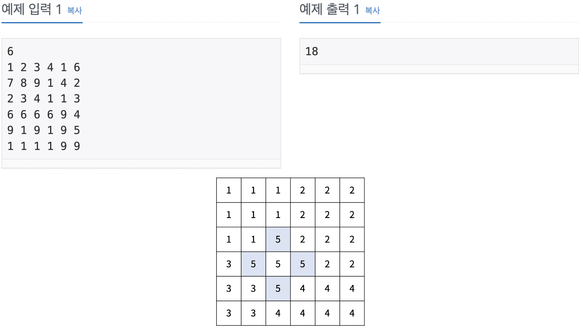 경계선도 5번 구역으로 포함하는 게 아니라 경계선 내부의 하얀색 5번만 5번 구역인 줄 알고, 그럼 5번 구역끼리 인접하지 않으니까 이건 잘못된 경계선이다 생각해서 이런 경우를 배제했다. 예제 답이 틀리게 나와서 확인해보니 경계선도 5번 구역으로 치더라.