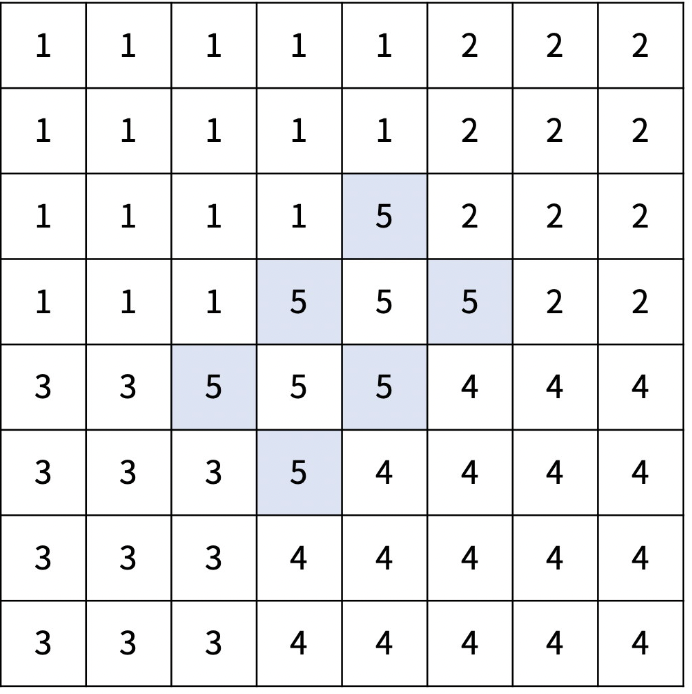 재현시는 크기가 N×N인 격자로 나타낼 수 있다. 격자의 각 칸은 구역을 의미하고, r행 c열에 있는 구역은 (r, c)로 나타낼 수 있다. 구역을 다섯 개의 선거구로 나눠야 하고, 각 구역은 다섯 선거구 중 하나에 포함되어야 한다. 선거구는 구역을 적어도 하나 포함해야 하고, 한 선거구에 포함되어 있는 구역은 모두 연결되어 있어야 한다. 구역 A에서 인접한 구역을 통해서 구역 B로 갈 수 있을 때, 두 구역은 연결되어 있다고 한다. 중간에 통하는 인접한 구역은 0개 이상이어야 하고, 모두 같은 선거구에 포함된 구역이어야 한다.