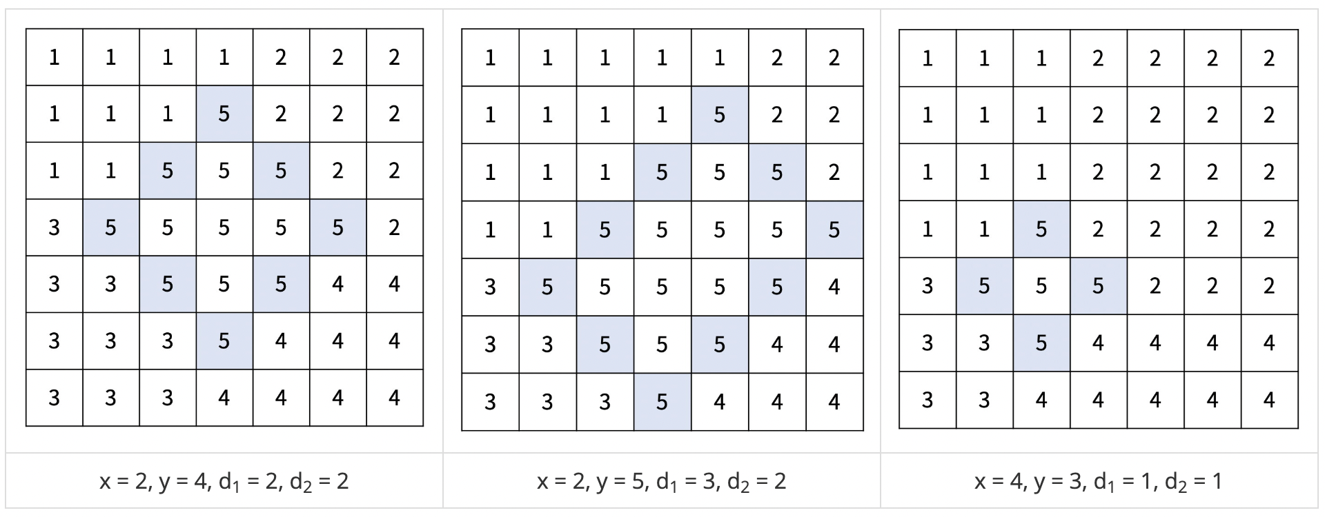 - (x, y), (x+1, y+1), ..., (x+d2, y+d2)