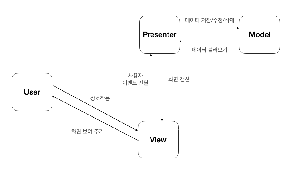 - 사용자와 상호작용하며 Presenter에 이벤트를 전달하고, Presenter를 통해 사용자가 요청한 데이터를 가져온다.