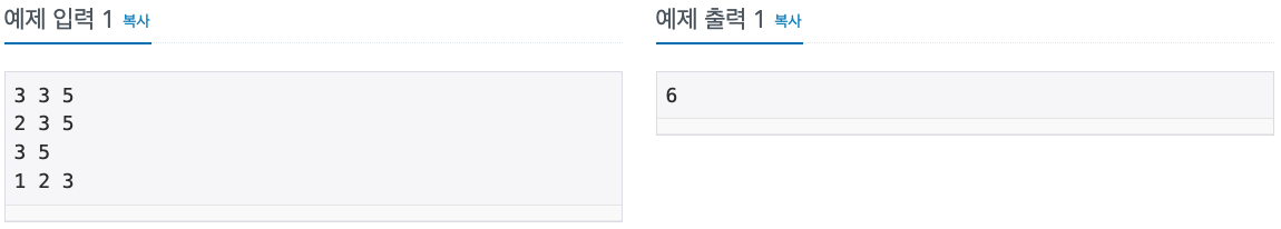 첫째 줄에 자연수 N, M, H가 공백을 기준으로 구분되어 주어진다. (1 ≤ N ≤ 50, 1 ≤ M ≤ 10, 1 ≤ H ≤ 1,000) 둘째 줄부터 N개의 줄에 걸쳐서 각 학생이 가진 블록들의 높이가 공백을 기준으로 구