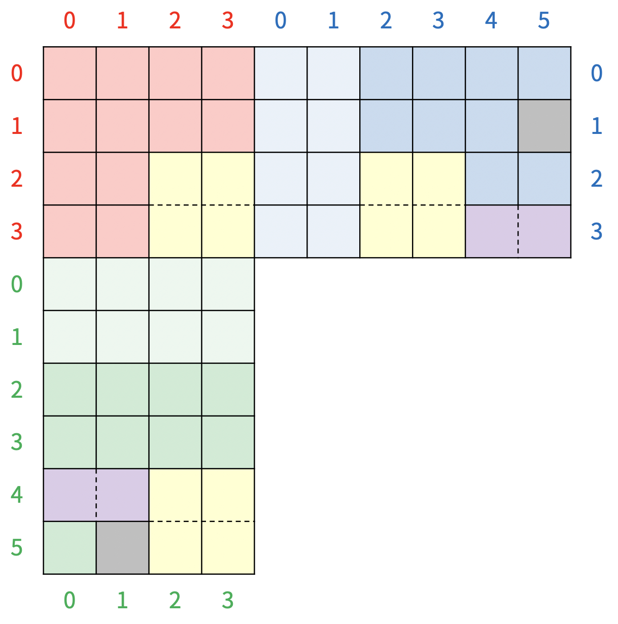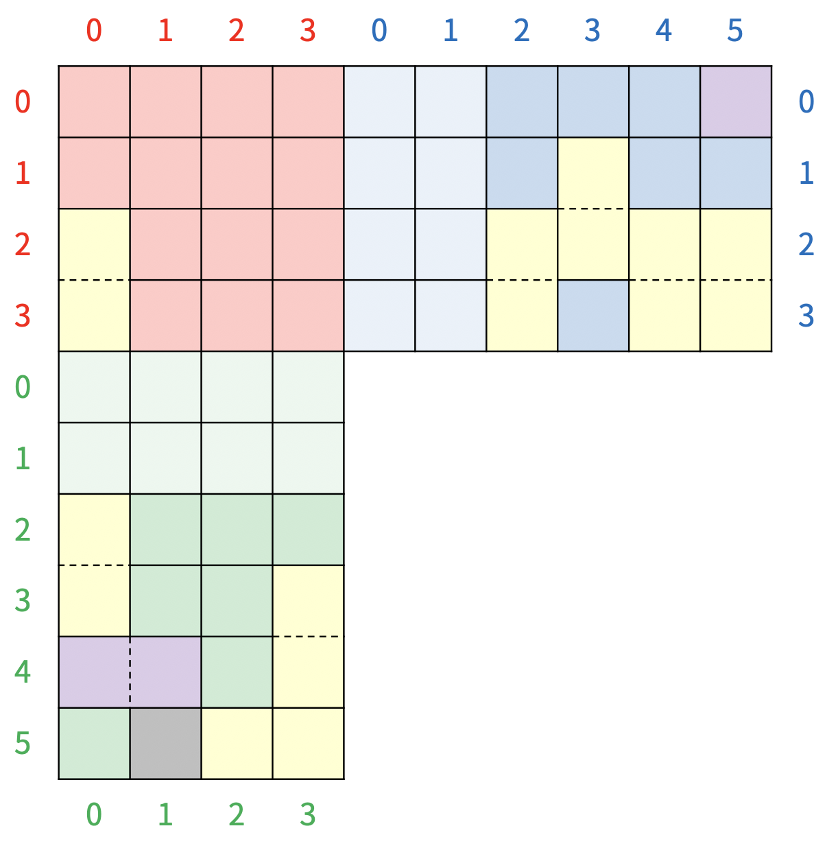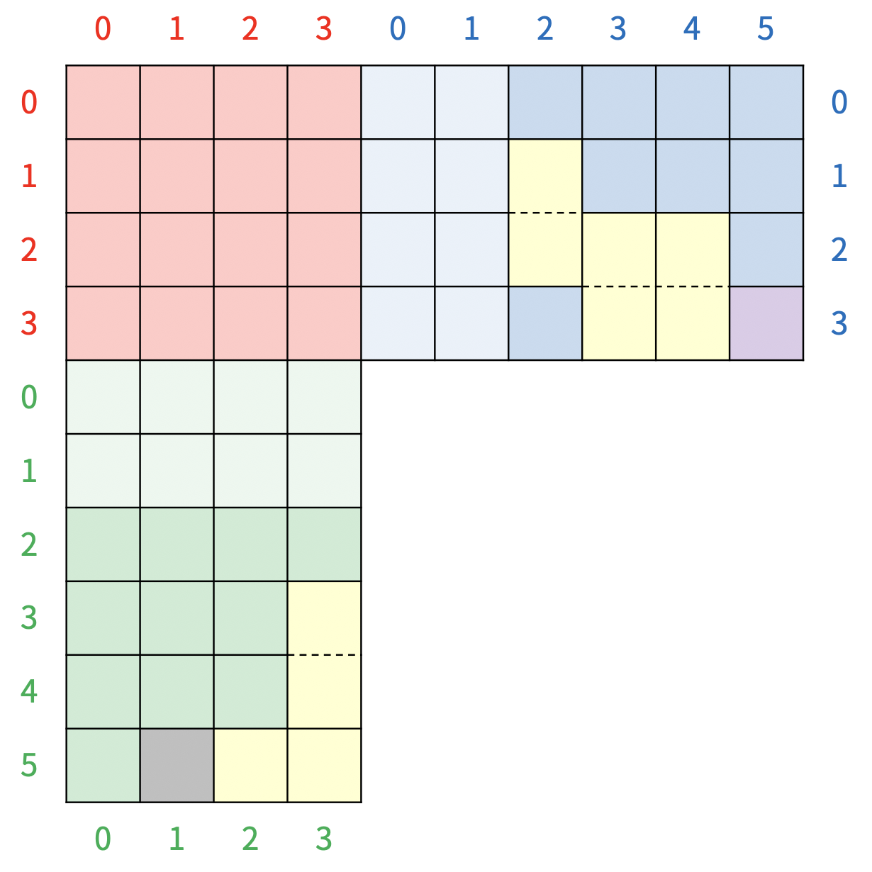 초록색 보드의 0, 1번 행과 파란색 보드의 0, 1번 열은 그림에는 연한색으로 표현되어 있는 특별한 칸이다. 초록색 보드의 0, 1번 행에 블록이 있으면, 블록이 있는 행의 수만큼 아래 행에 있는 타일이 사라지고, 초록색 보드의 모든 블록이 사라진 행의 수만큼 아래로 이동하고, 파란색 보드의 0, 1번 열에 블록이 있으면, 블록이 있는 열의 수만큼 오른쪽 열에 있는 타일이 사라지고, 파란색 보드의 모든 블록이 사라진 열의 수만큼 이동하게 된다. 위의 그림은 파란색 보드의 1번 열에 블록이 있기 때문에, 5번 열에 있는 블록이 모두 사라지고, 파란색 보드의 모든 블록이 오른쪽으로 한 칸 이동하게 된다. 따라서, 보드는 <그림 8>과 같이 변하게 된다.