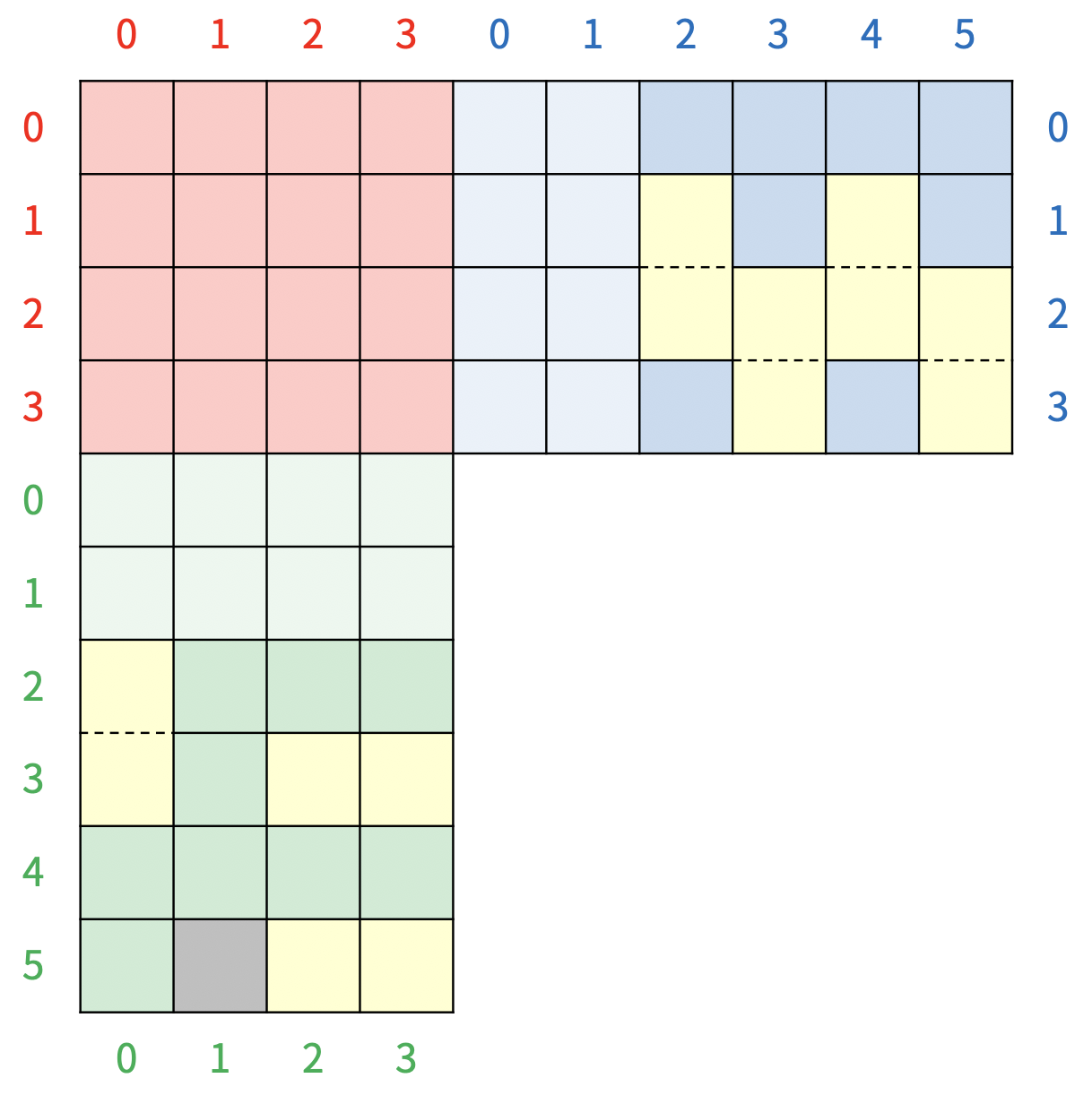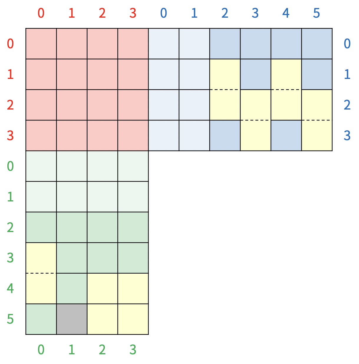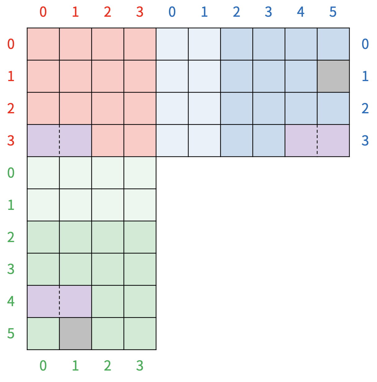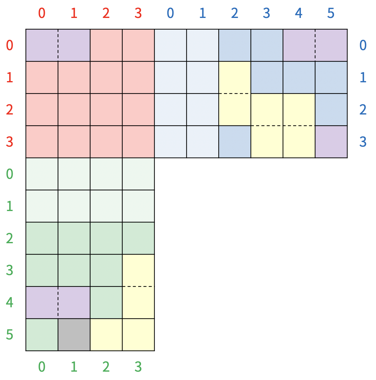 초록색 보드의 0, 1번 행과 파란색 보드의 0, 1번 열은 그림에는 연한색으로 표현되어 있는 특별한 칸이다. 초록색 보드의 0, 1번 행에 블록이 있으면, 블록이 있는 행의 수만큼 아래 행에 있는 타일이 사라지고, 초록색 보드의 모든 블록이 사라진 행의 수만큼 아래로 이동하고, 파란색 보드의 0, 1번 열에 블록이 있으면, 블록이 있는 열의 수만큼 오른쪽 열에 있는 타일이 사라지고, 파란색 보드의 모든 블록이 사라진 열의 수만큼 이동하게 된다. 위의 그림은 파란색 보드의 1번 열에 블록이 있기 때문에, 5번 열에 있는 블록이 모두 사라지고, 파란색 보드의 모든 블록이 오른쪽으로 한 칸 이동하게 된다. 따라서, 보드는 <그림 8>과 같이 변하게 된다.