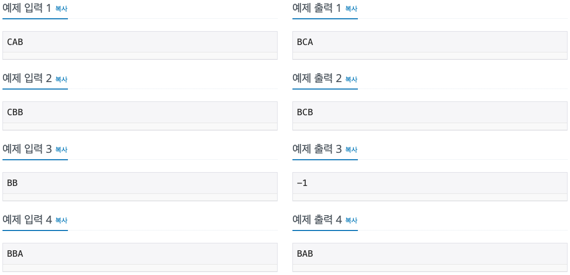 출근 기록 S가 주어졌을 때, S의 모든 순열 중에서 올바른 출근 기록인 것 아무거나 출력하는 프로그램을 작성하시오.