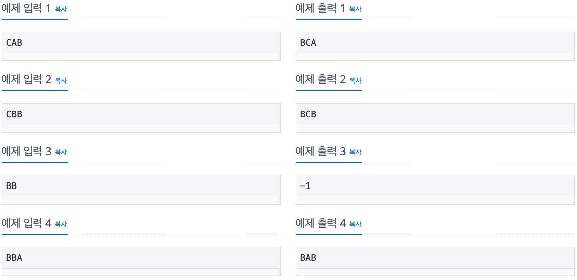 3. 다시 B,C,A중에 뭐 넣을지 검사할 때 B,C,A의 순서는 상관없다. A,B,C 모두 넣을 수 없다면 S길이의 답을 만들 수 없으므로 -1을 출력하고 종료한다.