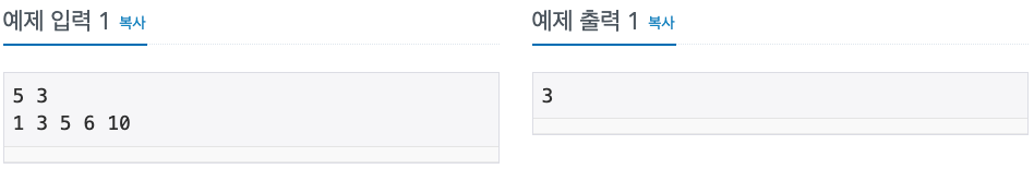 입력의 첫 줄에는 유치원에 있는 원생의 수를 나타내는 자연수 N(1 ≤ N ≤ 300,000)과 나누려고 하는 조의 개수를 나타내는 자연수 K(1 ≤ K ≤ N)가 공백으로 구분되어 주어진다. 다음 줄에는 원생들의 키를 나타내는 N개의 자연수가 공백으로 구분되어 줄 서 있는 순서대로 주어진다. 태양이는 원생들을 키 순서대로 줄 세웠으므로, 왼쪽에 있는 원생이 오른쪽에 있는 원생보다 크지 않다. 원생의 키는 109를 넘지 않는 자연수이다.