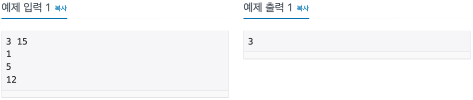 첫째 줄에 n, k가 주어진다. (1 ≤ n ≤ 100, 1 ≤ k ≤ 10,000) 다음 n개의 줄에는 각각의 동전의 가치가 주어진다. 동전의 가치는 100,000보다 작거나 같은 자연수이다. 가치가 같은 동전이 여러 번 주어질 수도 있다.